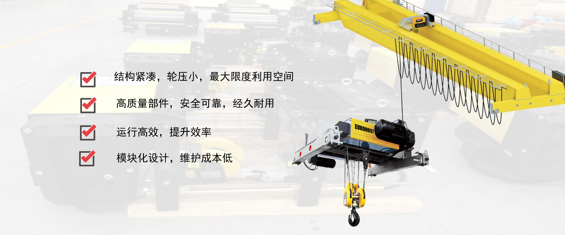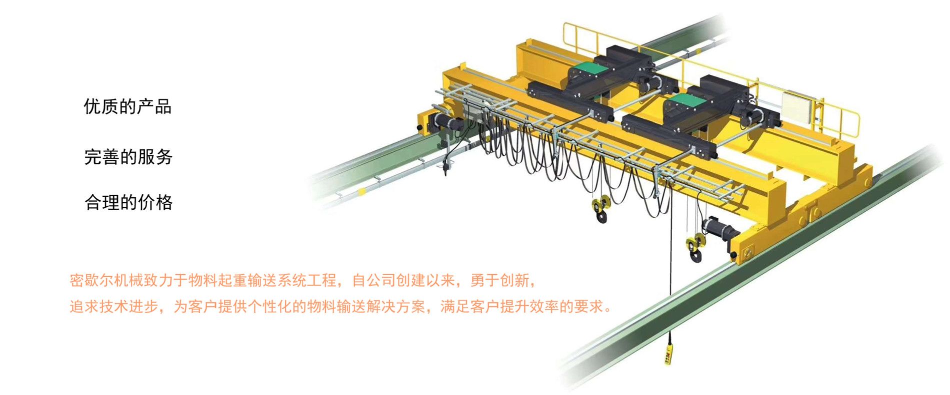 密歇爾起重機械(杭州)有限公司提供全面的起重輸送產(chǎn)品和服務(wù),產(chǎn)品覆蓋環(huán)鏈電動葫蘆(125Kg-80T),歐式鋼絲繩葫蘆,防爆葫蘆,懸臂吊,KBK柔性起重機,歐式起重機,起重馬達,端梁,起重移動供電系統(tǒng)等,在國內(nèi)外被廣泛的應(yīng)用于生產(chǎn)車間,汽車,模具,機械制造,鐵路,船舶,物流搬運,現(xiàn)代化工廠流水線等工業(yè)及其它特殊用途。